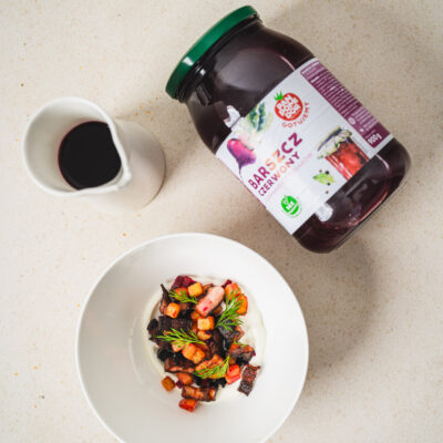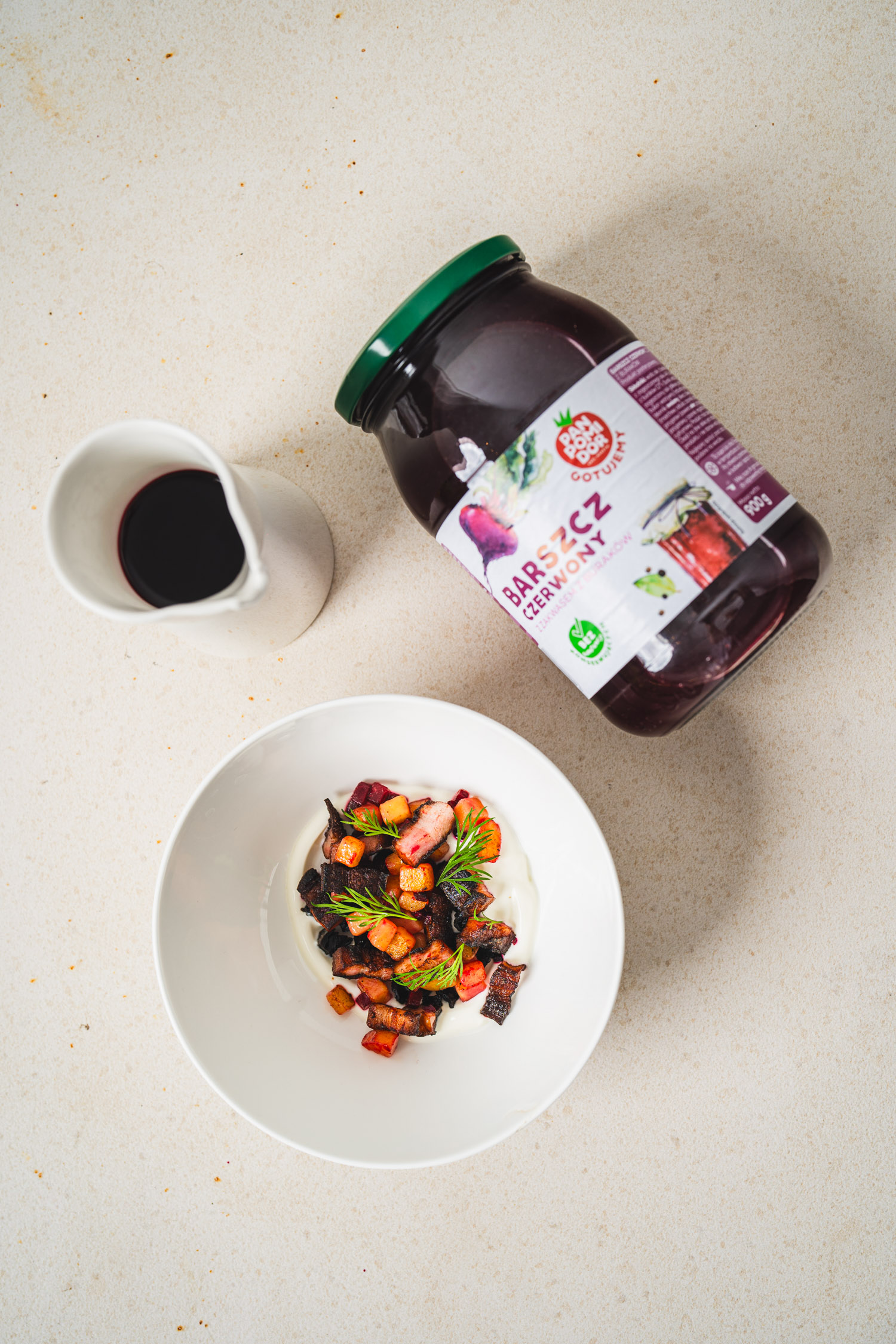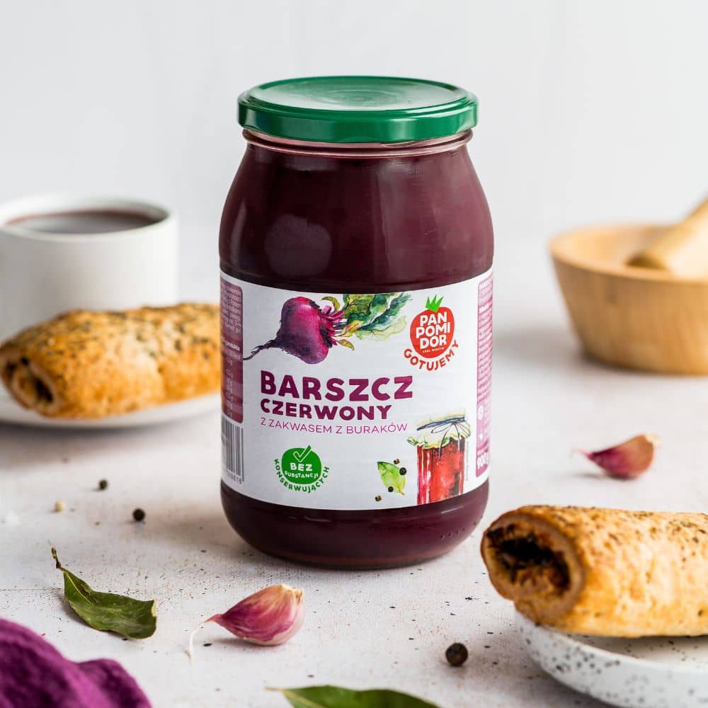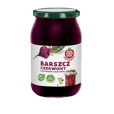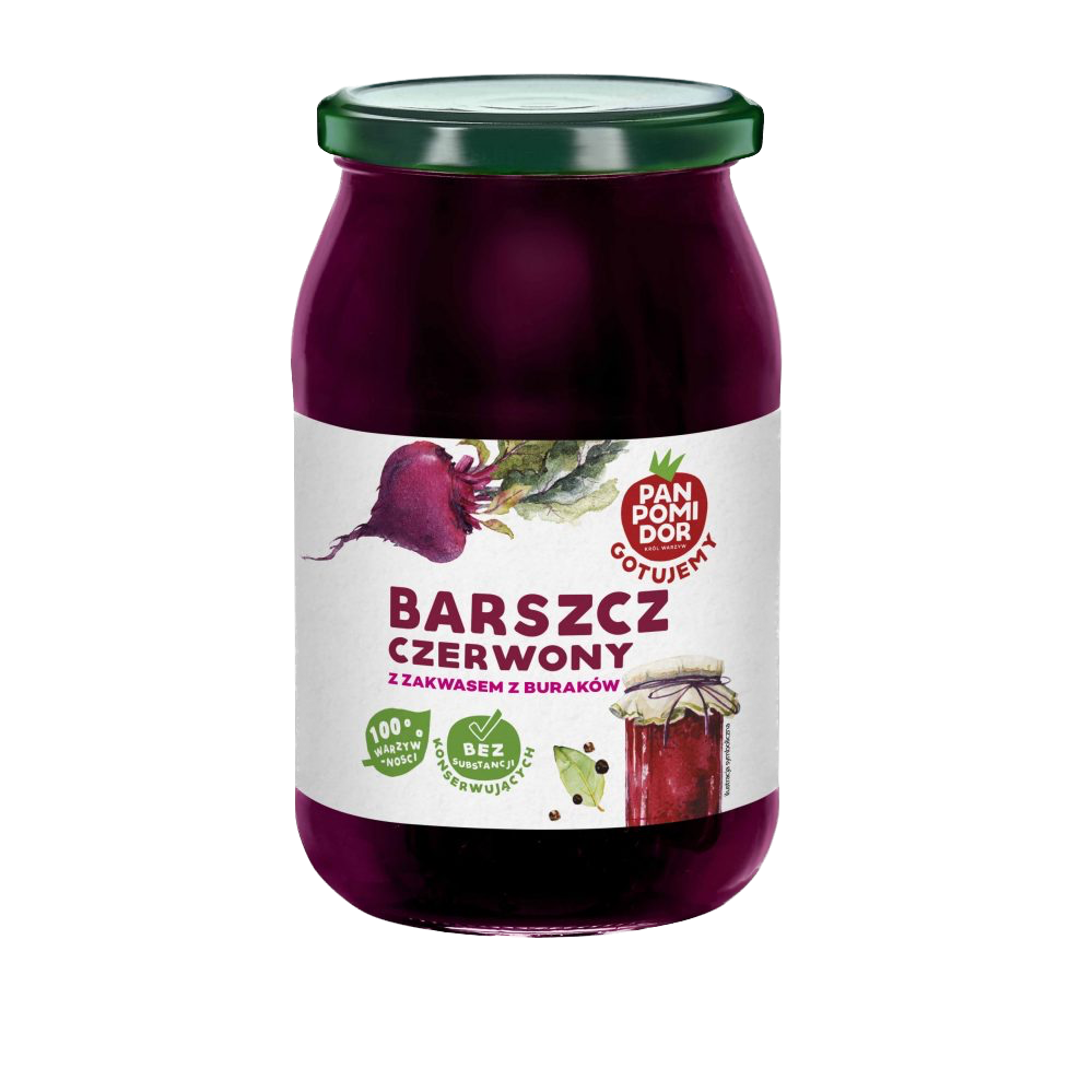 zakwas z buraków 0,7% (buraki, woda, sól, czosnek), zagęszczony sok jabłkowy, ocet spirytusowy, bulion warzywny (naturalny ekstrakt drożdżowy, błonnik owsiany, oliwa z oliwek, suszone warzywa (marchew, cebula, czosnek), naturalne ekstrakty przypraw (zawiera seler) przyprawy, zioła), przyprawy, czosnek, regulator kwasowości: kwas cytrynowy.