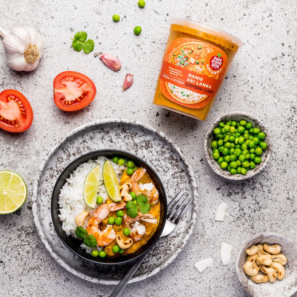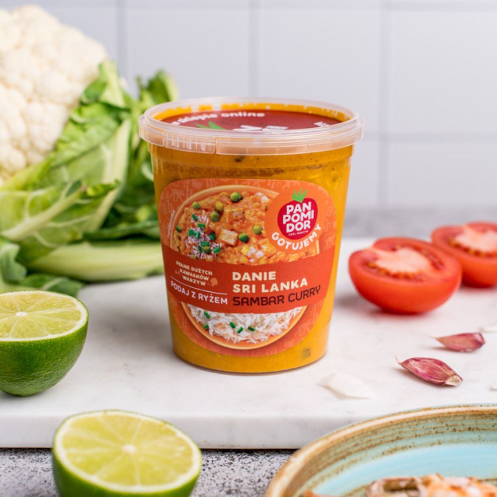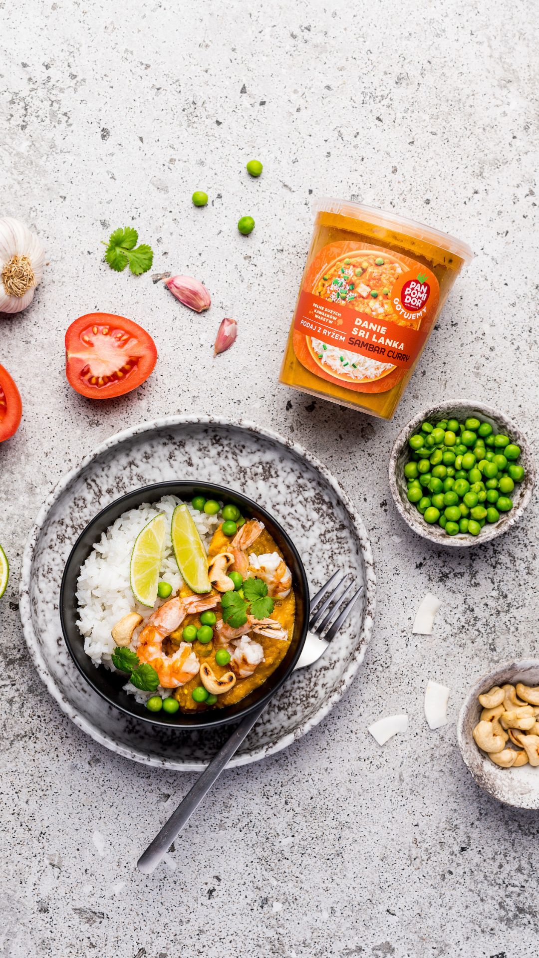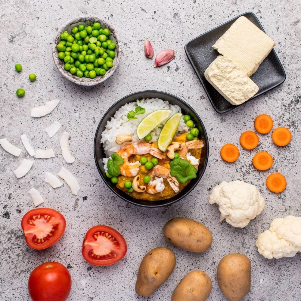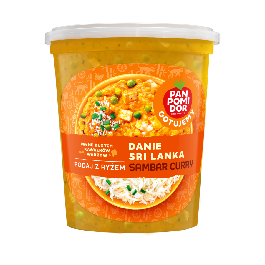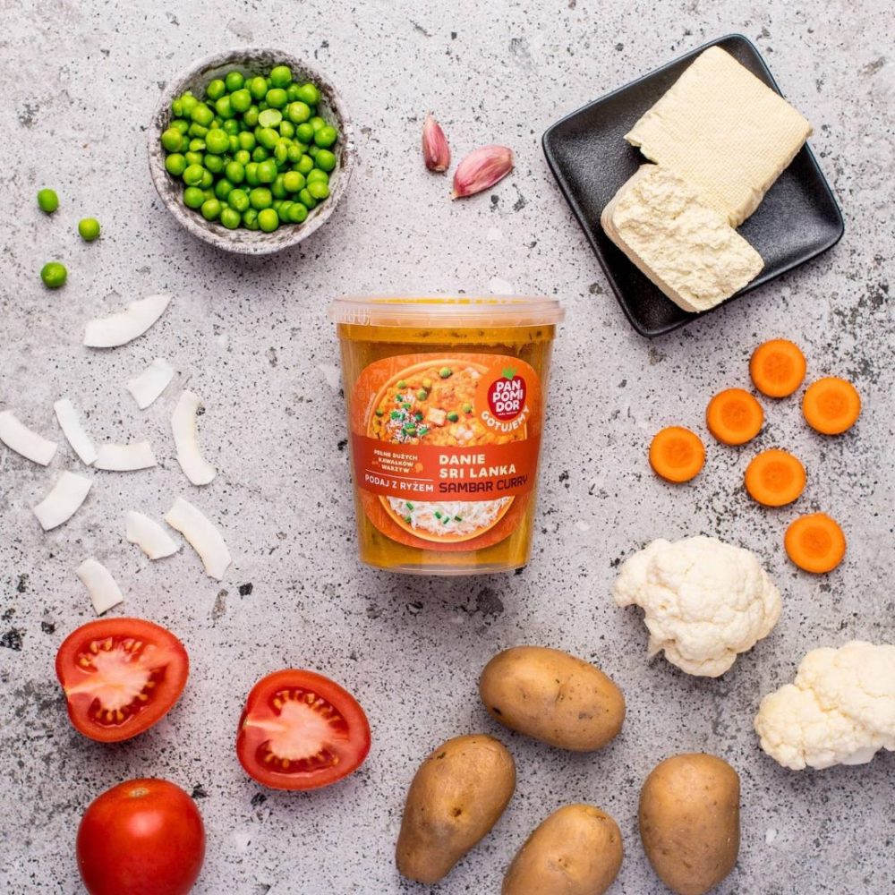 groszek zielony, ekstrakt orzecha kokosowego, tofu naturalne (woda, ziarno soi, substancja wiążąca – siarczan wapnia), cebula, marchew, cukier, wiórki kokosowe, czosnek, sól, przyprawy (zawiera gorczycę), zioła, olej rzepakowy.