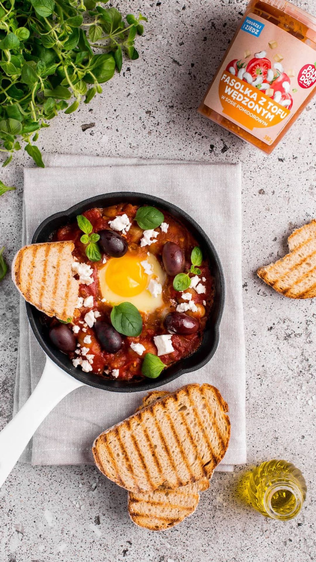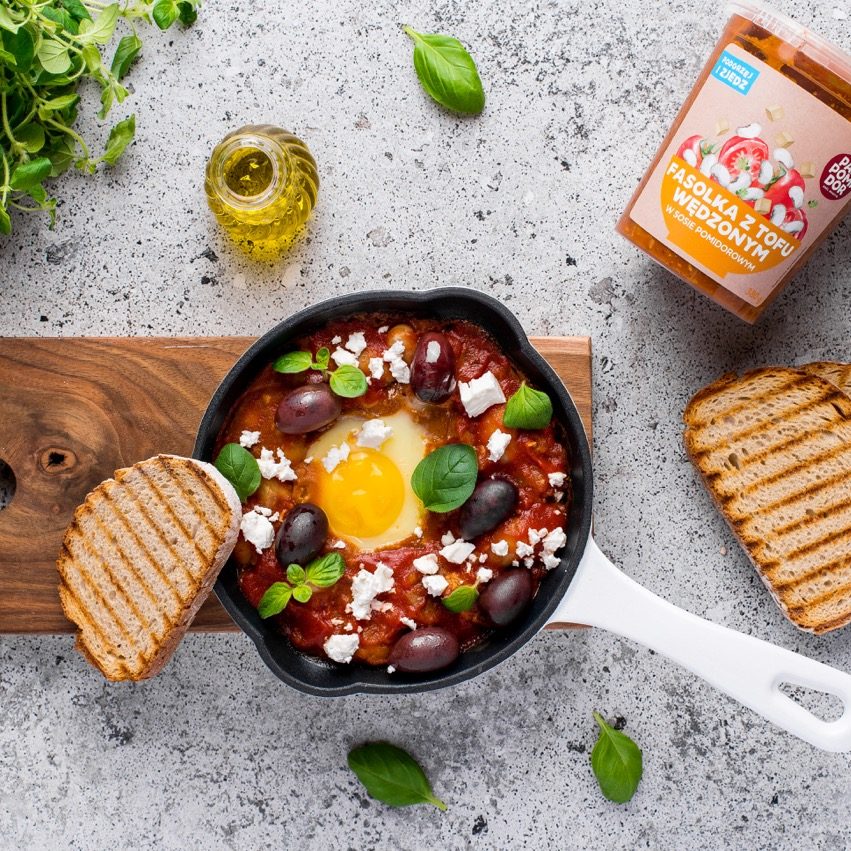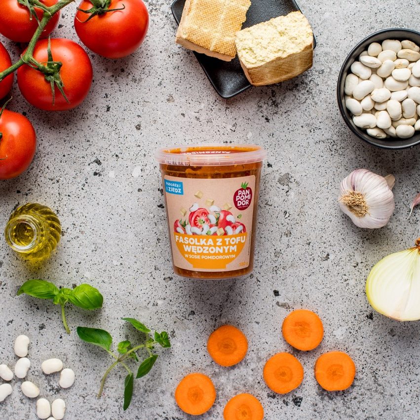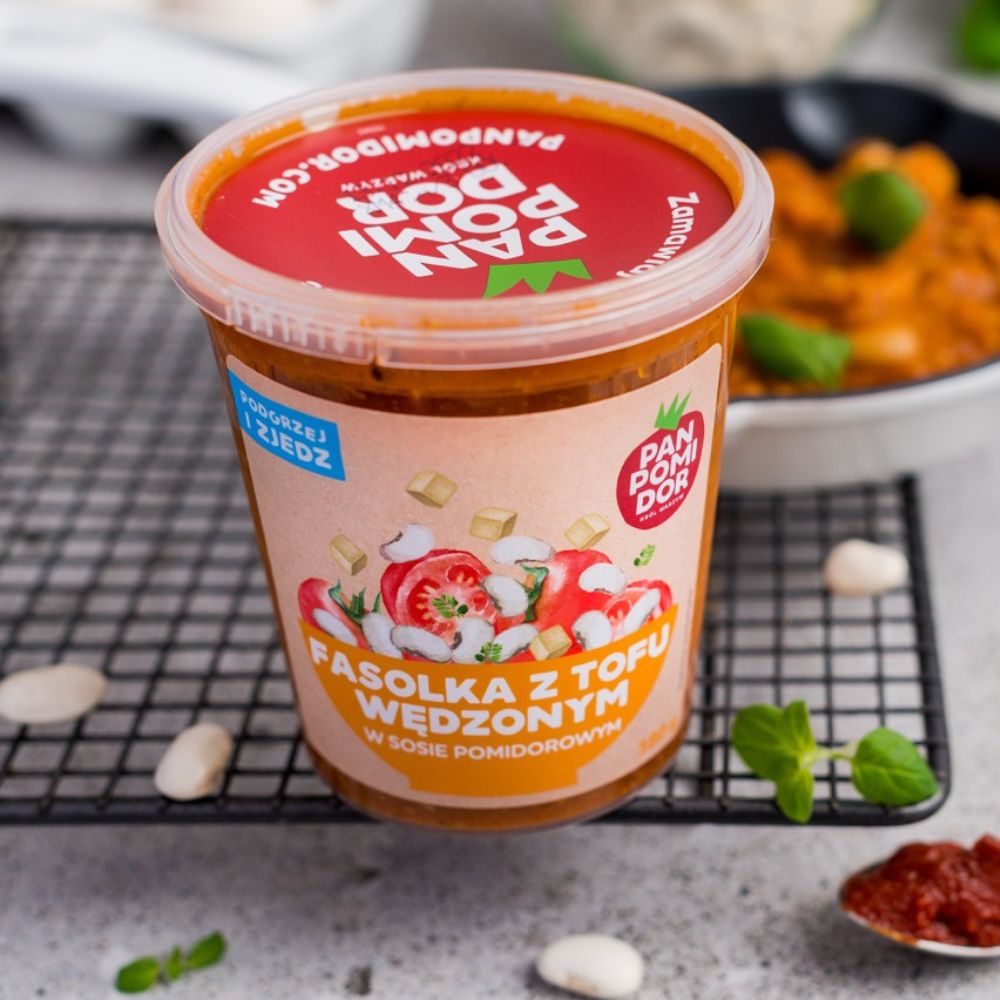 biała fasola ugotowana 31%, woda, pomidory 13%, tofu wędzone 8% (woda, ziarno soi, sól, substancja wiążąca – siarczan wapnia, aromat dymu wędzarniczego), marchew, cebula, koncentrat pomidorowy 3%, cukier, olej rzepakowy, sól, śliwka, suszona sól morska wędzona, czosnek, przyprawy (zawiera gorczycę), majeranek