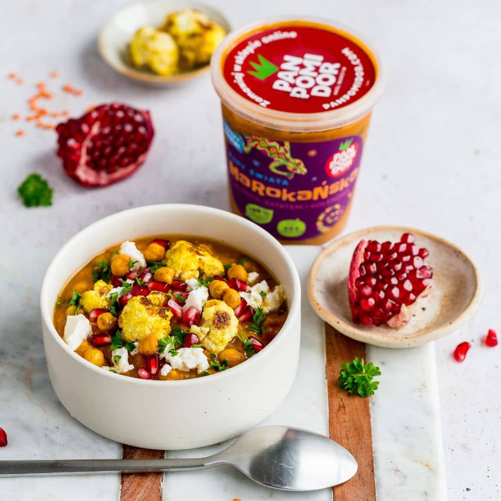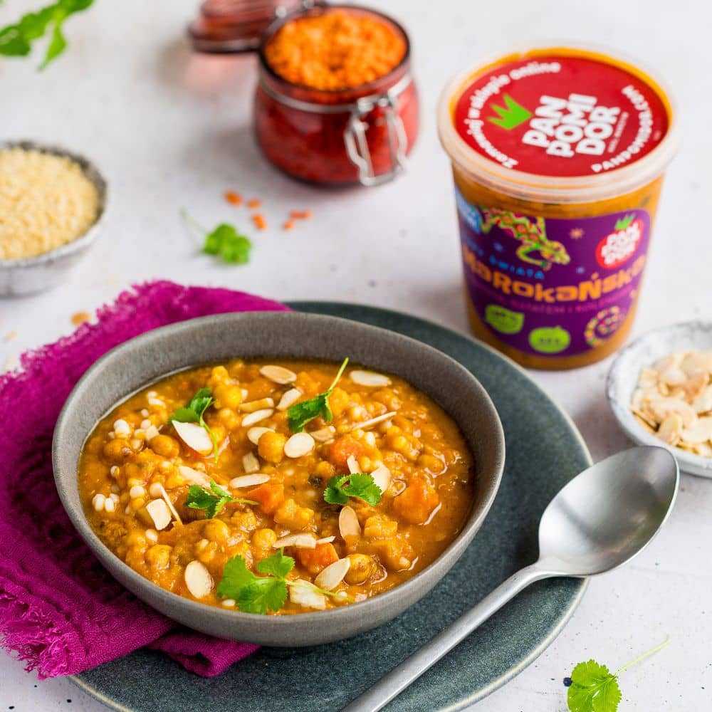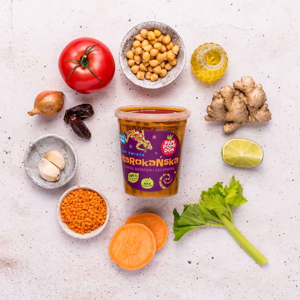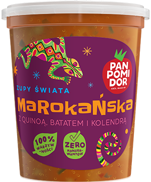 woda, pomidory, marchew, quinoa 5,6%, bataty 4,4%, cebula, soczewica czerwona, ciecierzyca 2,2%, seler naciowy, daktyle, koncentrat pomidorowy, olej rzepakowy, sól, natka kolendry 0,67%, natka pietruszki, czosnek, przyprawy, zagęszczony sok z limonki, imbir.