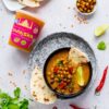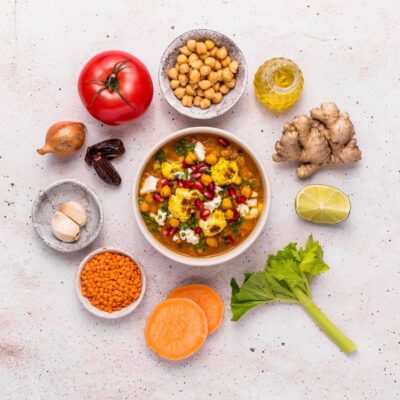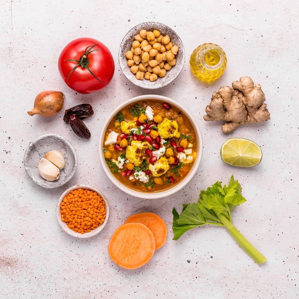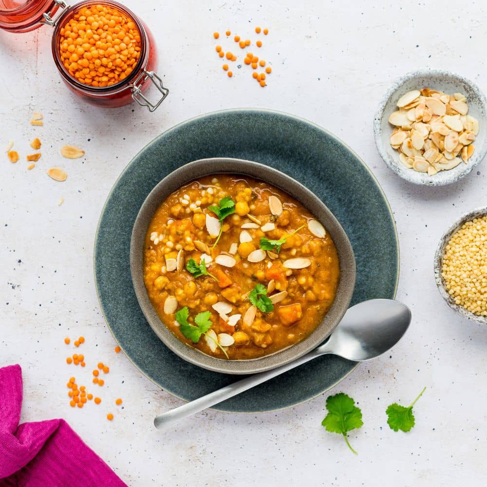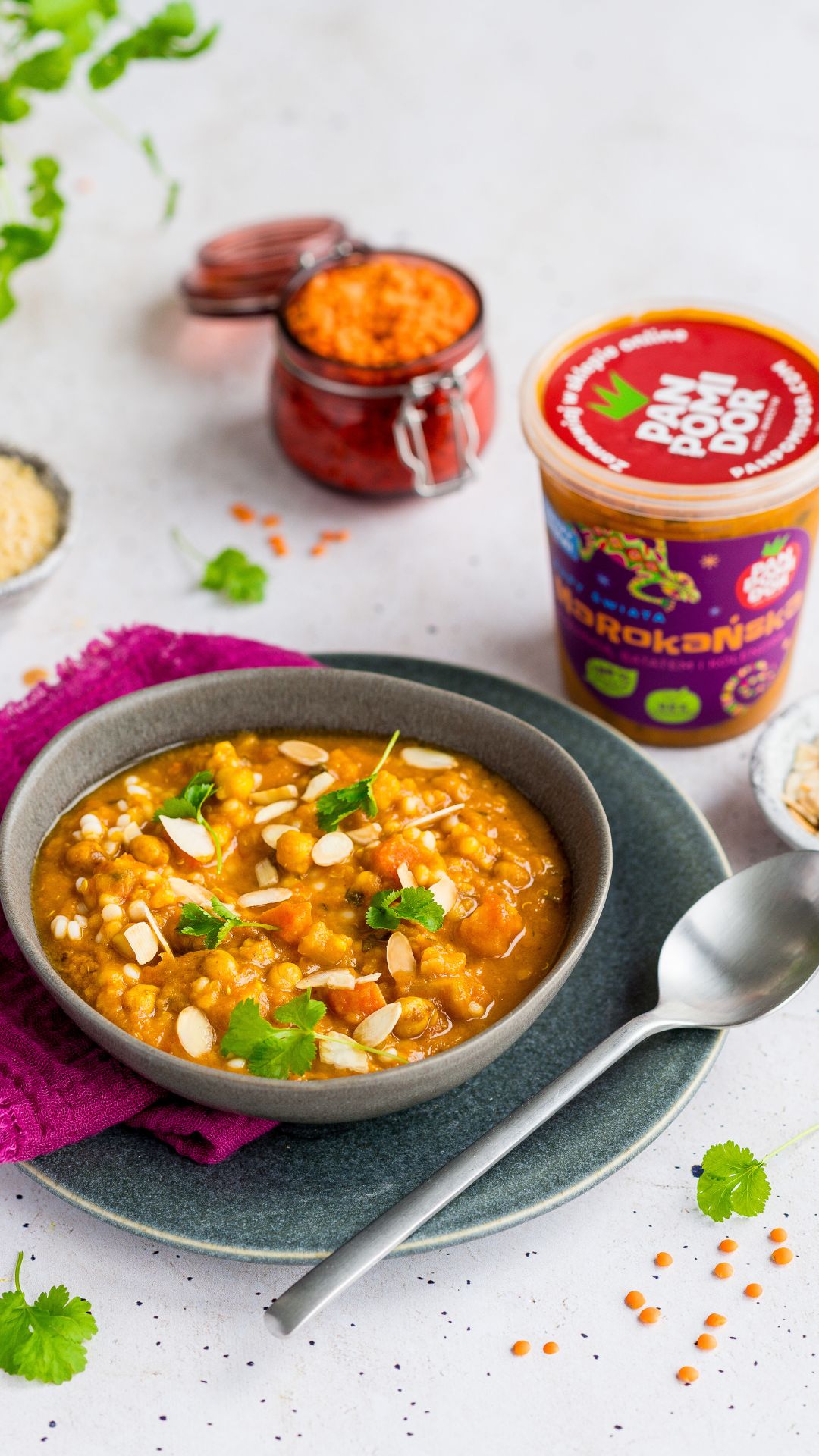 woda, pomidory, marchew, quinoa 5,6%, bataty 4,4%, cebula, soczewica czerwona, ciecierzyca 2,2%, seler naciowy, daktyle, koncentrat pomidorowy, olej rzepakowy, sól, natka kolendry 0,67%, natka pietruszki, czosnek, przyprawy, zagęszczony sok z limonki, imbir.