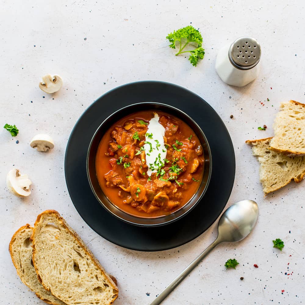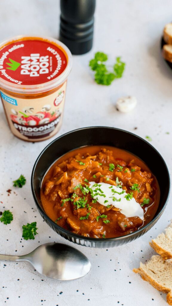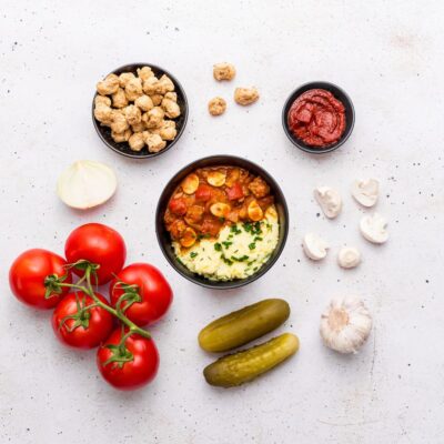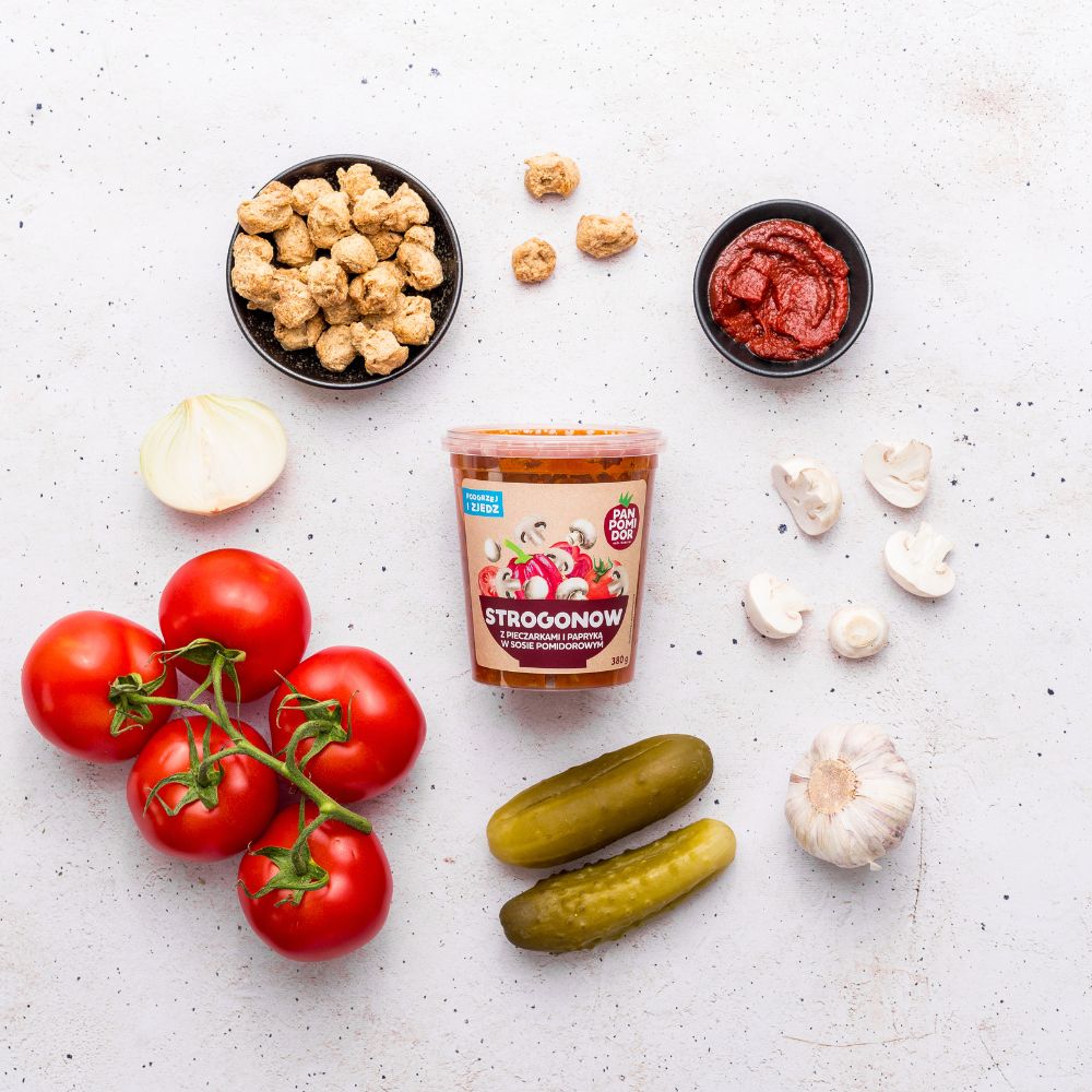 pomidory 22%, pieczarki 21%, cebula, woda, papryka czerwona 10%, koncentrat pomidorowy 4%, kostki sojowe (odtłuszczona mąka sojowa), ogórek kiszony (ogórki, woda, sól, mieszanka przypraw), olej rzepakowy, sól, czosnek, przyprawy, cukier.